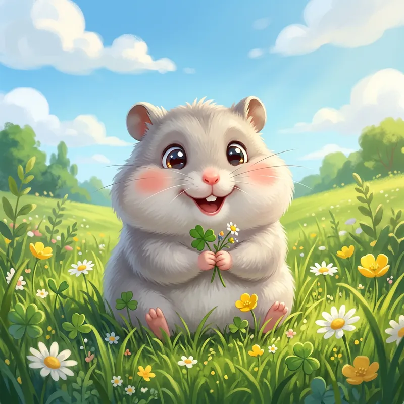 An animated depiction of an ultra-cute hamster with a light gray body and large eyes. The hamster is joyfully smiling while set against a backdrop of blue sky and green grass.