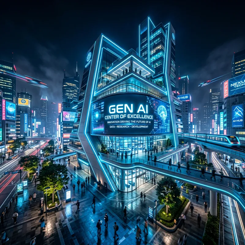 An ultra-modern tech hub exhibiting a sleek, minimalist architecture equipped with screens that emit a soft blue light. These screens display the words 'Gen AI Center of Excellence', implying the hub's dedication towards artificial intelligence. The scene is captured in a high-resolution format to underscore the crisp details of the architecture and technology. Drawing inspiration from cyberpunk aesthetics, the hub is illuminated by radiant neon lights. This entire image is captured as a night cityscape, viewed through the lens of a wide-angle perspective, comparable to photos taken by a high-resolution camera like the Canon EOS R5.