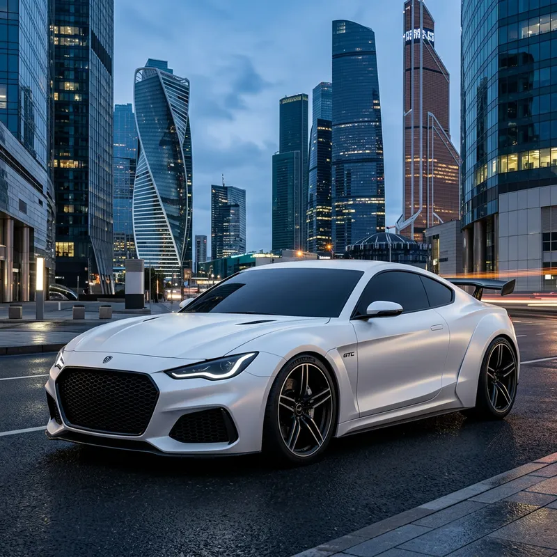 Create an ultra-modern conceptual image of a two-door sports car. The car is satiny Alpine White and boasts a streamlined form, giving an impression of staggering speed, even when it's not moving. The front fascia is dominated by a large, black grill, above which are sleek, curved LED headlights. Broad wheel arches make room for impressive low-profile tires on large, 21-inch, 5-spoke wheels. Tinted windows give the car a mysterious aura, and a rear spoiler adds an extra touch of sportiness. The vehicle is parked against an edgy urban backdrop of tall steel and glass skyscrapers.