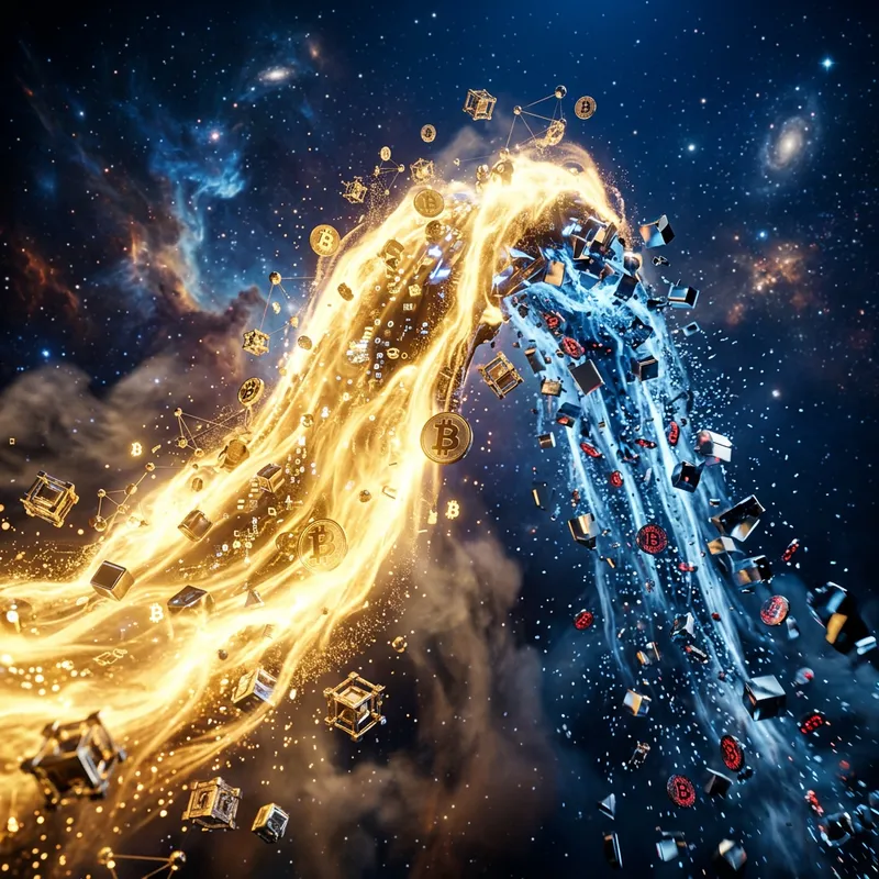 Ultra-realistic 3D rendered financial visualization, Bitcoin cryptocurrency market volatility concept art, dramatic upward flowing golden energy waves transitioning into downward cascading streams, representing market rise then fall, cosmic deep space background with distant stars and nebulae, floating geometric blockchain elements and digital currency symbols, dramatic cinematic lighting with rim lighting effects, volumetric fog and particle effects, deep blue to black gradient atmosphere, professional trading floor ambiance, high contrast shadows, photorealistic materials with metallic gold and chrome surfaces, 8K resolution, depth of field blur, no text or typography, shot with cinematic camera angle, trending on Artstation, octane render quality.