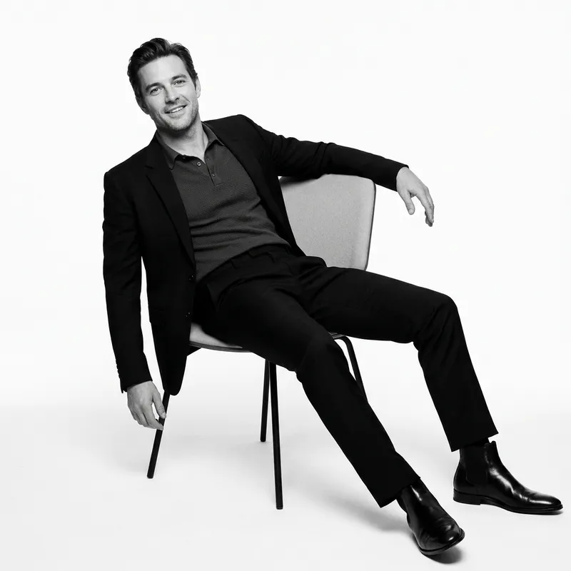 Ultra-realistic black and white fashion editorial portrait of the uploaded person (preserve face 100%). Reclined dramatically on a chair, one arm resting over backrest, legs wide apart, exuding bold confidence. Wearing a tailored dark suit with casual knit shirt, polished boots. Expression relaxed but magnetic, playful high-fashion energy. Studio background clean white. Avant-garde GQ editorial style.