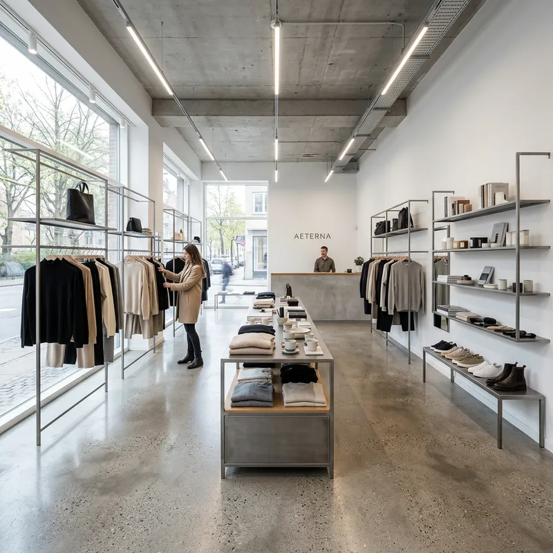 Ultra-detailed high-resolution 8K photograph of a contemporary minimalistic shop with sleek metal displays and polished concrete flooring. The space is bright, clean, exuding minimalist elegance. Shot with a Canon EOS 6D camera.