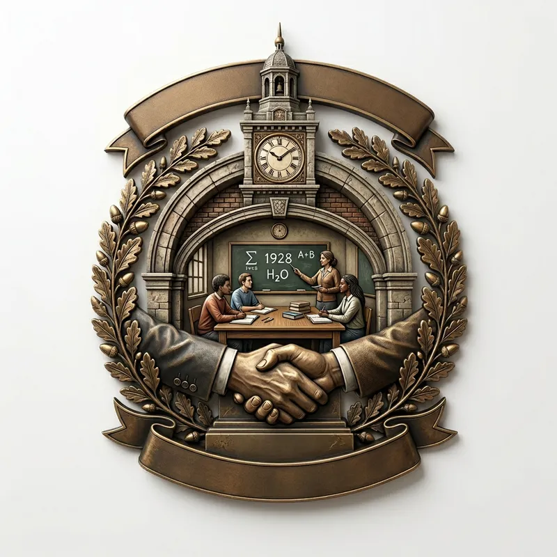 Create an ultra-realistic logo for a foundation. The logo should consist of three key symbols: a clock tower to represent time and heritage, a group of people in a classroom setting to signify education and learning, and a handshake between two individuals to denote job placement and employment opportunities.