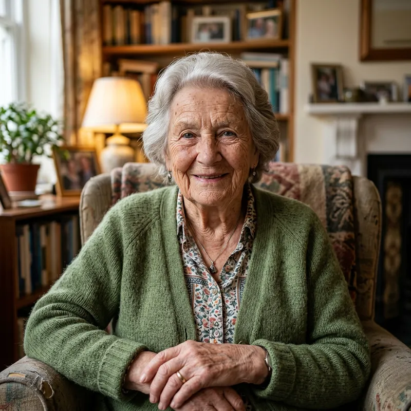 ultra-realistic portrait of an old lady, detailed skin texture, wise eyes, gentle smile, with a background of a cozy room.