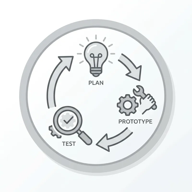 Create an icon image epitomizing the idea of ultra-simple product development. The icon should encompass minimalistic design techniques, with clear signs representing product planning, prototype making, and product testing phases. Please incorporate basic shapes and clean lines in your design, keeping the color palette neutral and subtle.