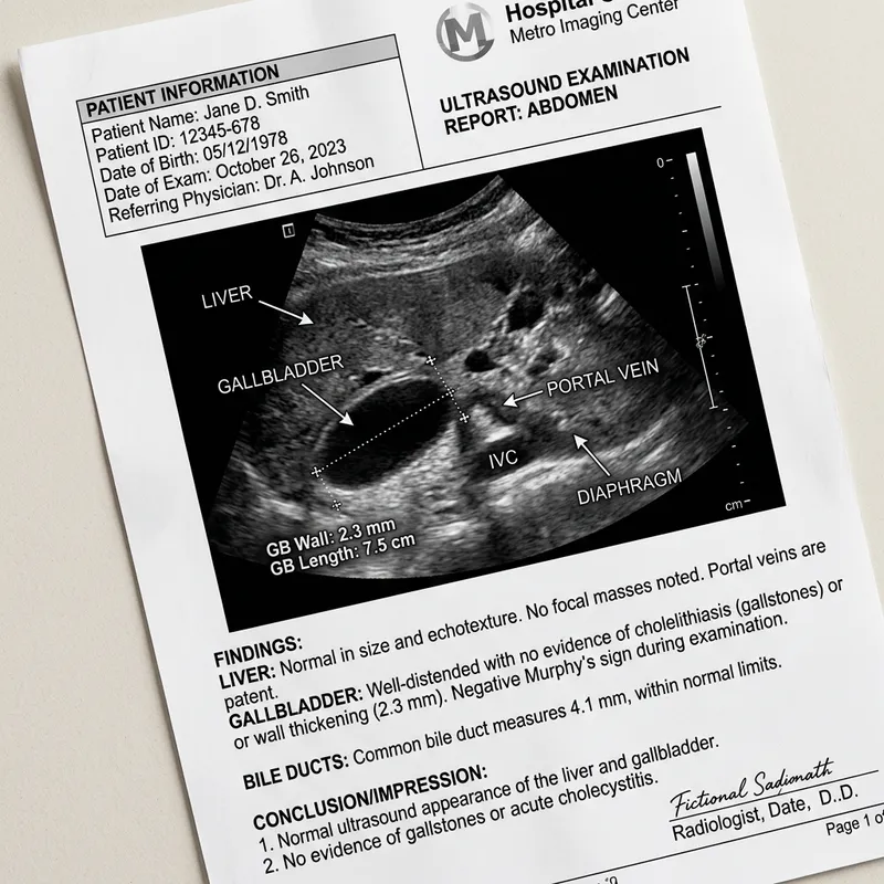 A detailed illustration of an ultrasound report. The report consists of a medical document featuring ambiguous clusters of black, white, and greyscale blotches - representative of typical imaging presented in ultrasound reports. This image is accompanied by medical terminologies and annotations, and a scale for reference. A side panel with some standardized details can be seen, such as patient's name, doctor's name, date, and description of the procedure. Note that all the names and dates are fictional and generic, bearing no relation to real individuals. Ensure that the focus is on the scientific and medical aspect of the report.