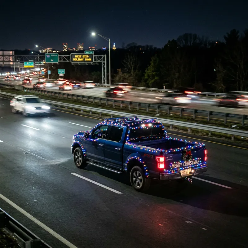 a navy blue truck with hanging Christmas lights driving on a highway at night.