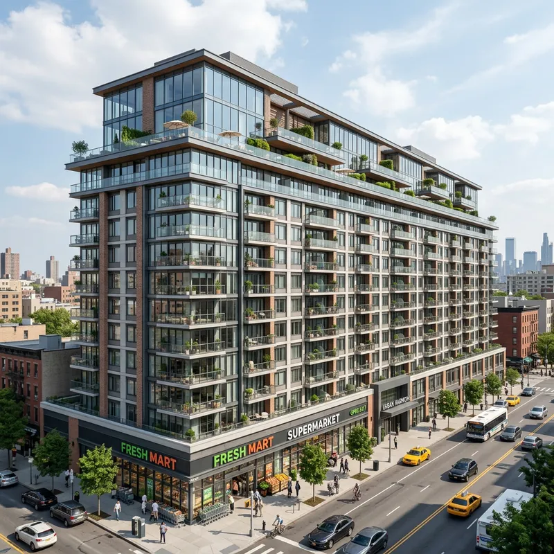 A front building of 150 m with 16 floors, a supermarket on the ground floor, and a triplex on the top.