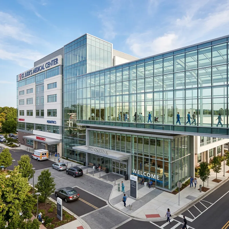 A 5-story second-level hospital with main connector featuring natural lighting and glass entrance panels.