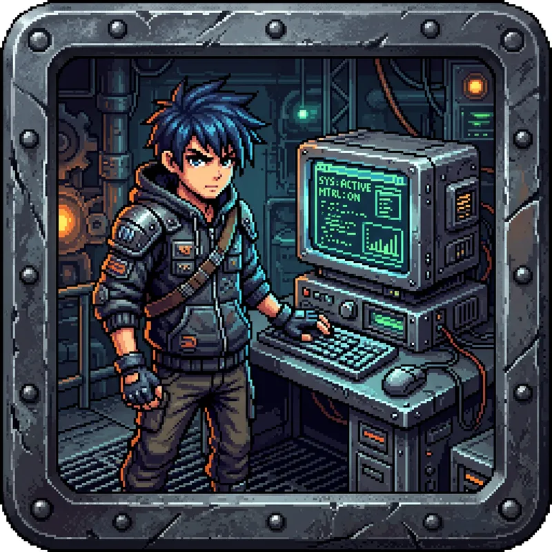 An icon of a pixel where an anime boy stands out with his computer in a metal style.