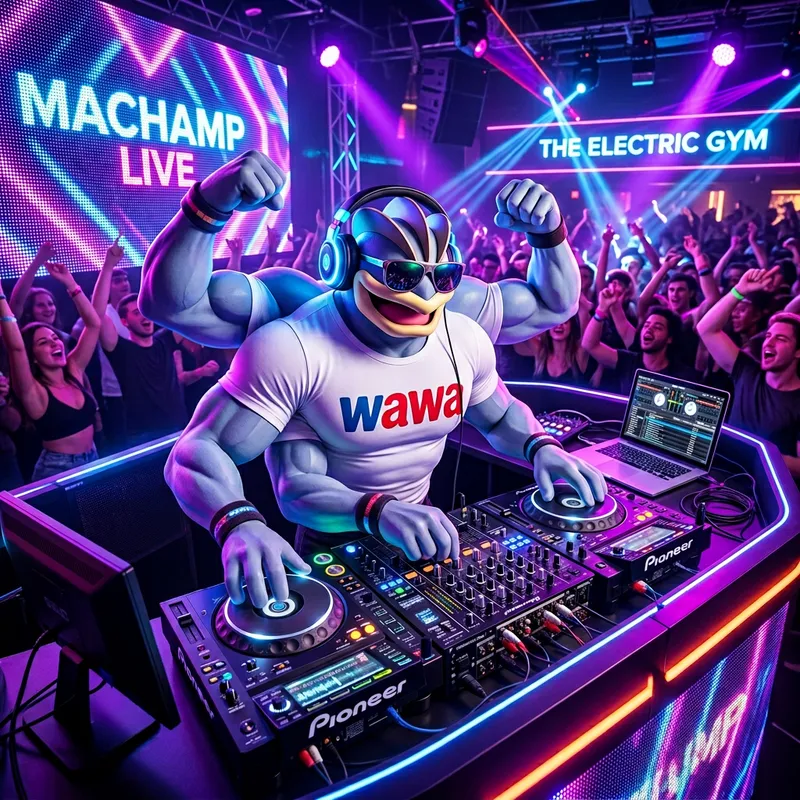 Machamp the DJ: Unleashing Beats in a Neon Club