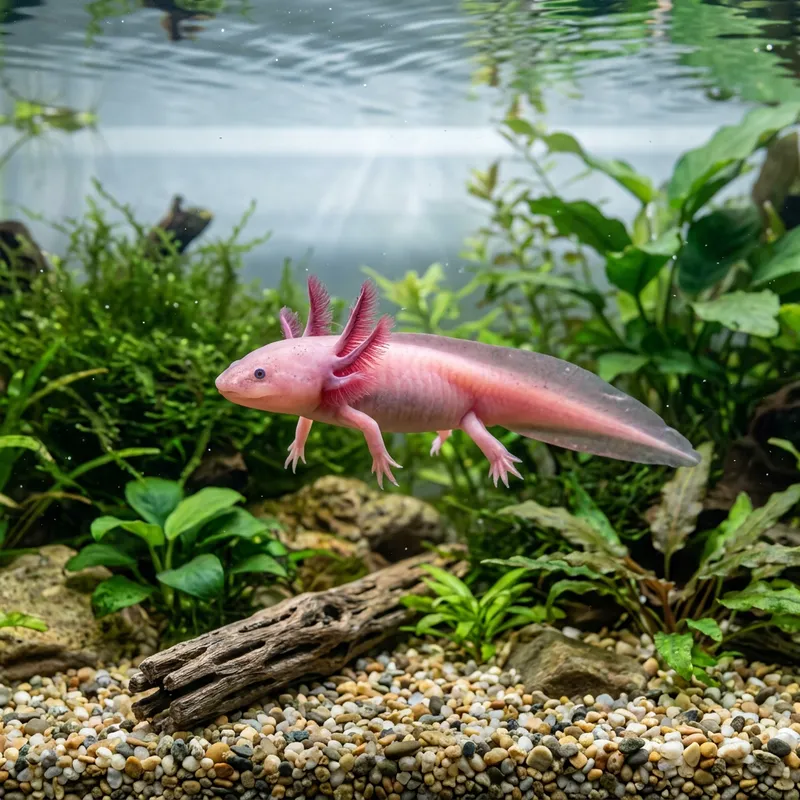 A small axolotl, a type of salamander that stays in its larval stage throughout its life, swimming in clear, fresh water.