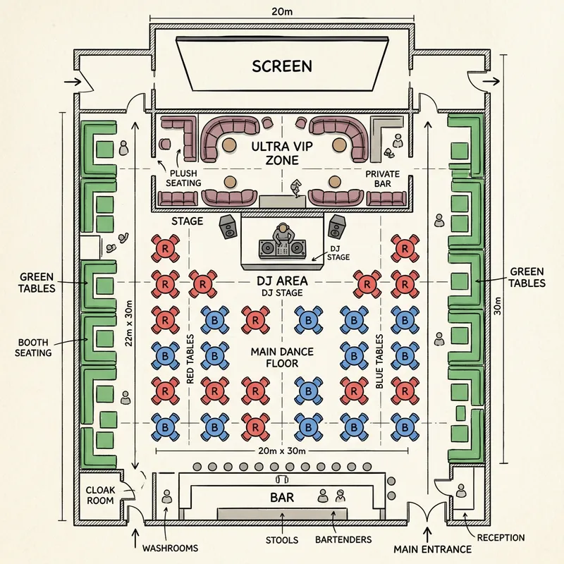 A schematic plan for an event space with: • A rectangular bar at the bottom. • A screen at the top. • A centered DJ area above, in front of a well-structured Ultra VIP zone. • A centered Ultra VIP area at the top. • Green tables along the walls on the left and right. • Harmoniously arranged red and blue tables in the center. All viewed from above, in a simple and clear style, in sketch format.