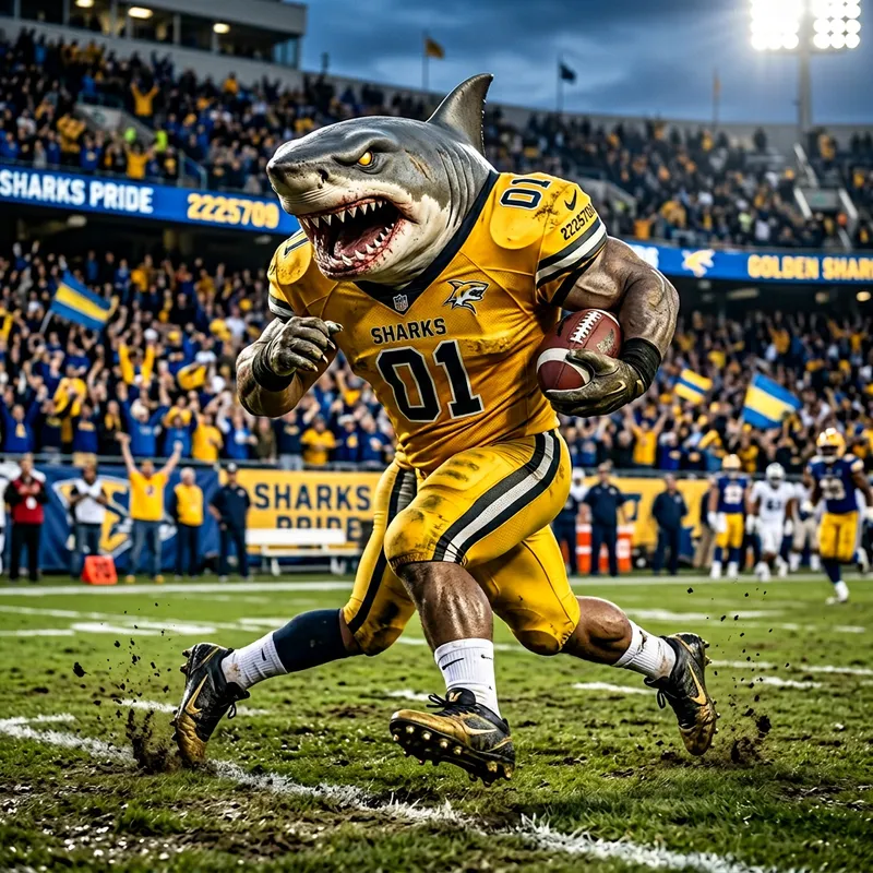 An aggressive shark, football mascot with its golden shirt, golden shorts, and soccer shoes.