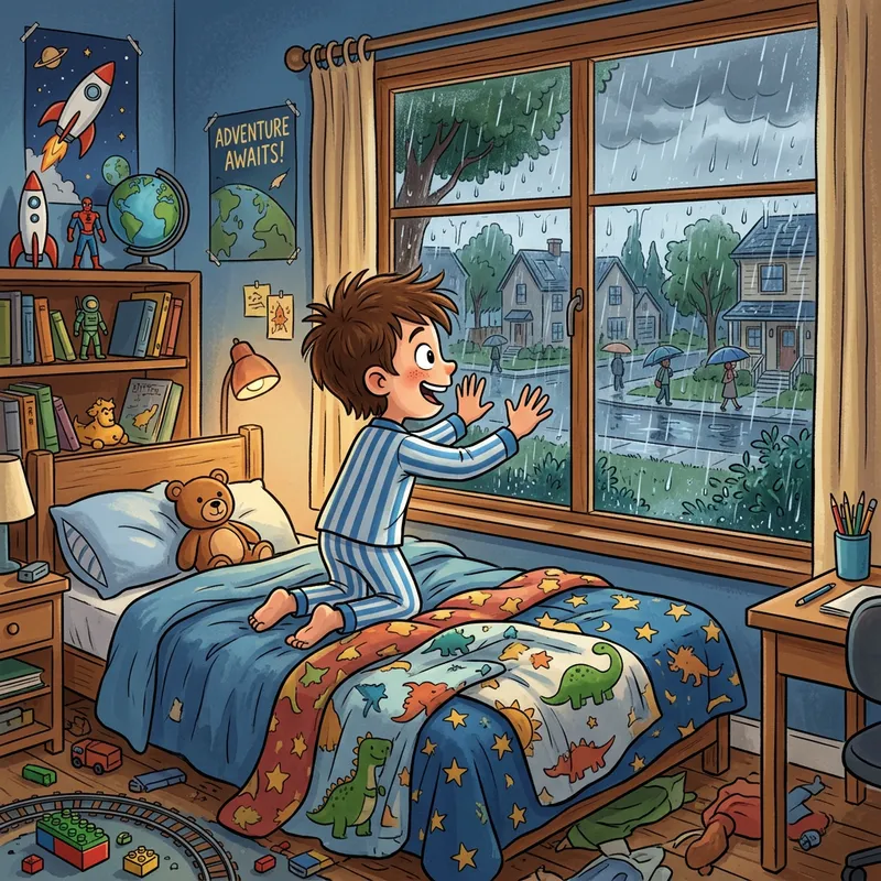 A cartoon image of a boy waking up in his room and excitedly looking at the rain through his window.
