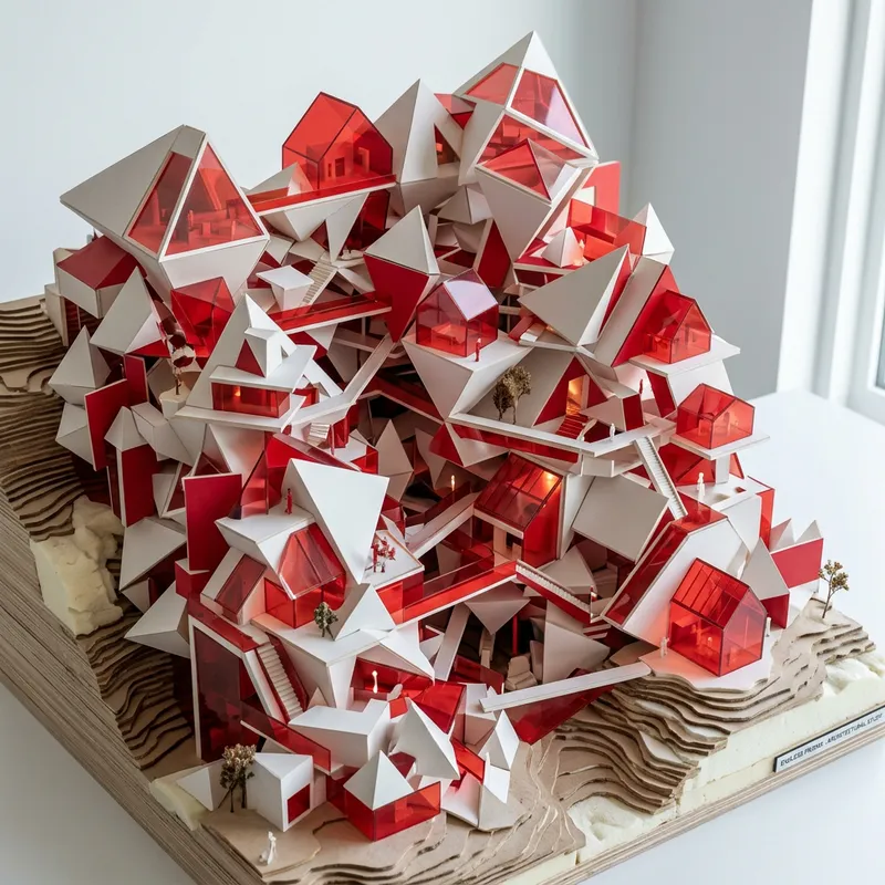 An architectural model of a structure that features pyramidal or prism shapes, plays with spaces and levels, is very crazy and gives a sense of never-ending, must have red, transparent red, and white colors, and interact with the terrain.