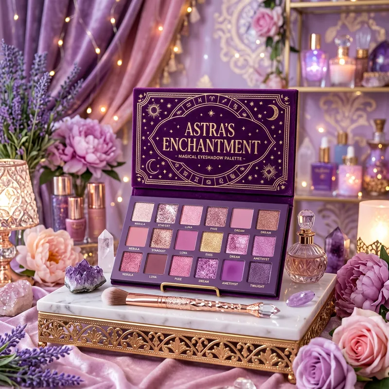 A palette of eyeshadows displayed in a luxury store, with a purple and pink background, fantasy style, girl style, very detailed, high resolution.