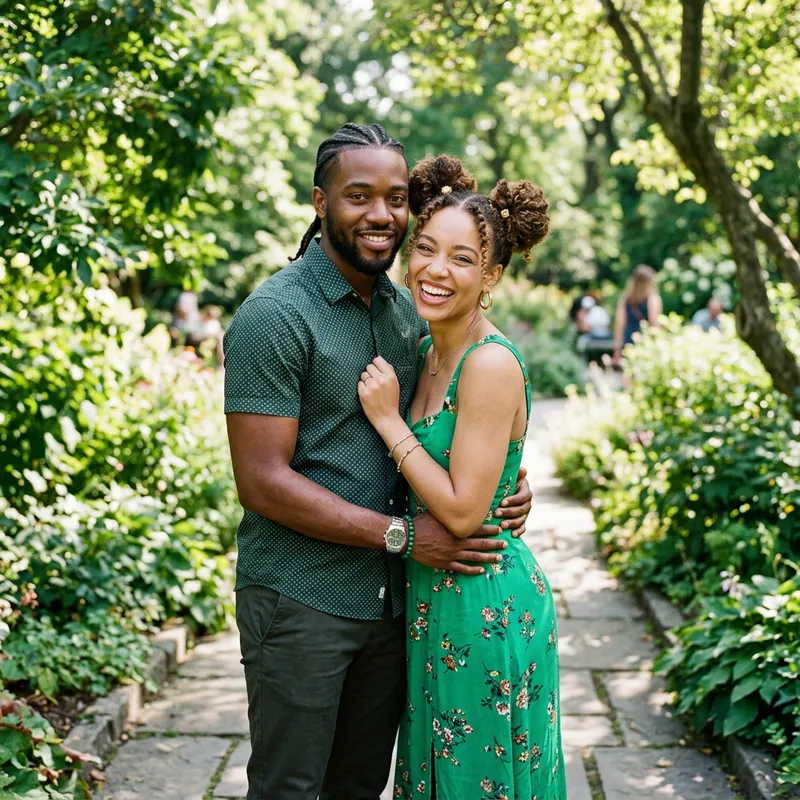 A couple dressed in green details, a man with braids and brown eyes, and an Afro-American girl with two buns and light brown eyes posing.