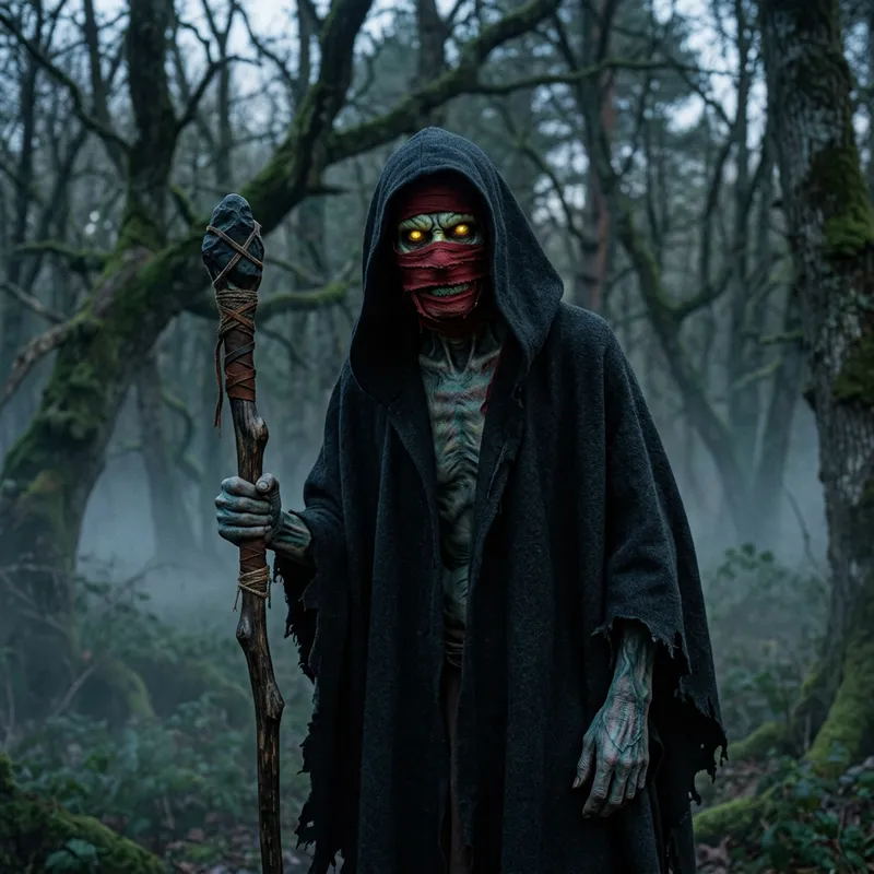 Imagine a figure from a fantasy world. This individual is depicted as an undead being with an emaciated physique. The skin is tarnished with hues of blue-green, suggesting a state of decay. A dark cloak and hood is draped over the body which enhances its mysterious presence. Covering the face is a red bandage, contrasting with the necrotic skin. Beneath the bandage, you can see two glowing yellow eyes radiating an eerie luminescence. The figure also holds a rustic wooden staff, further establishing its arcane persona.