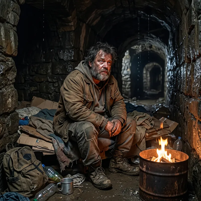 An overweight, short statured individual with scruffy appearance who seems to be battling substance abuse, residing in a large underground labyrinth. The labyrinth is dark and moist, filled with echoes of dripping water. The individual is characterized by a feeling of exhaustion and despair, their clothes tattered and hair unkempt, yet with a glimmer of hope in their eyes. They sit on a makeshift bed made of discarded materials in a poorly lit corner of the tunnel, accompanied by a small fire for warmth.