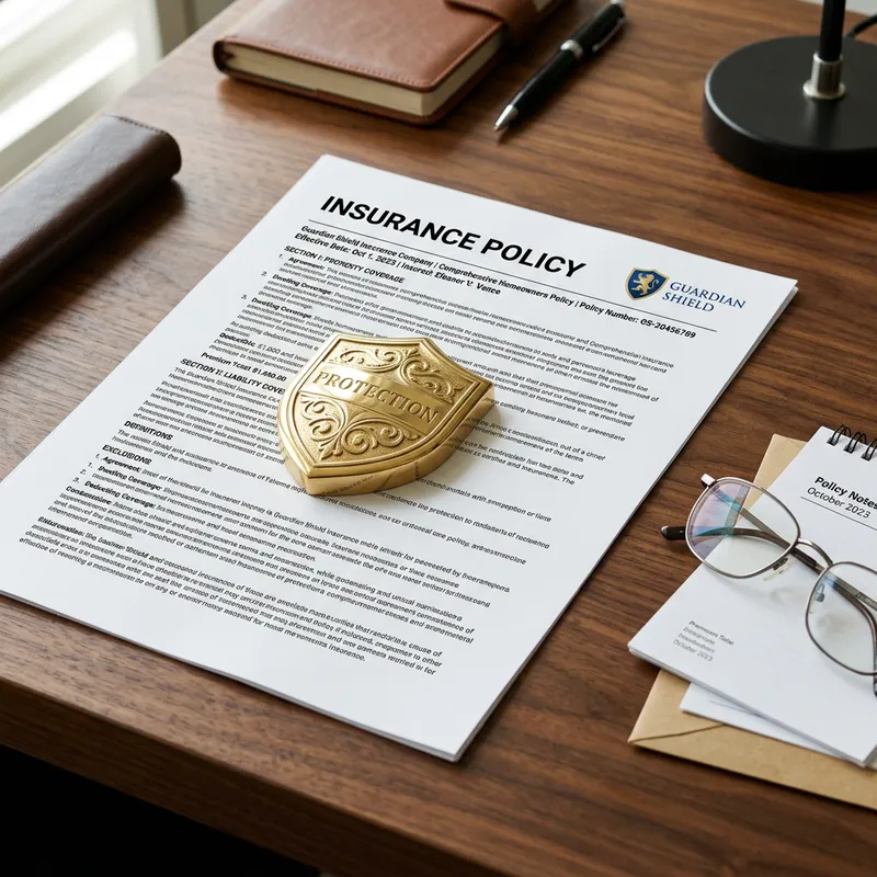 A detailed image of an insurance policy. The document is laying flat on a polished wooden desk. It has the header 'Insurance Policy' written in clear, bold black letters at the top. There are multiple paragraphs containing comprehensive insurance details printed in a smaller, professional font. There's a company logo on the top right corner. The paper is crisp, white, and legal-sized. A shiny, golden paperweight in the shape of a shield symbolizing protection is resting on top of the paper. Some related paperwork and a pair of reading glasses are nearby on the desk.