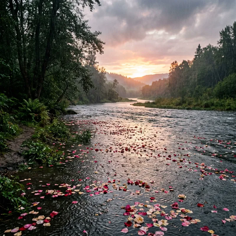 Captivating River Scene with Rain and Rose Petals at Dawn