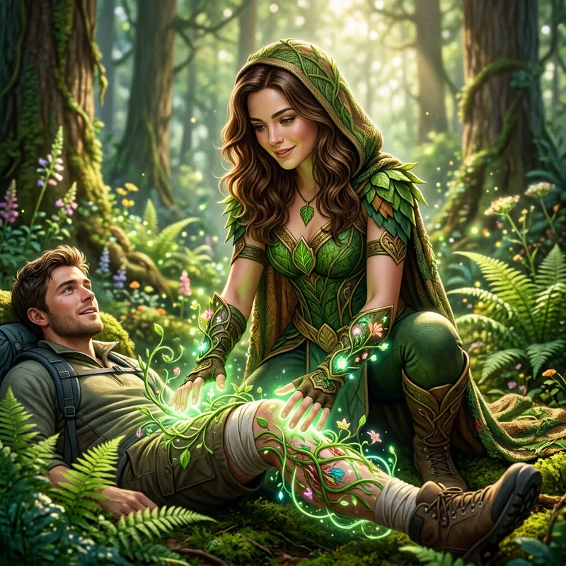 a superhero whose powers are healing through plants. She must be a brunette with medium-length hair, average build, and very beautiful.