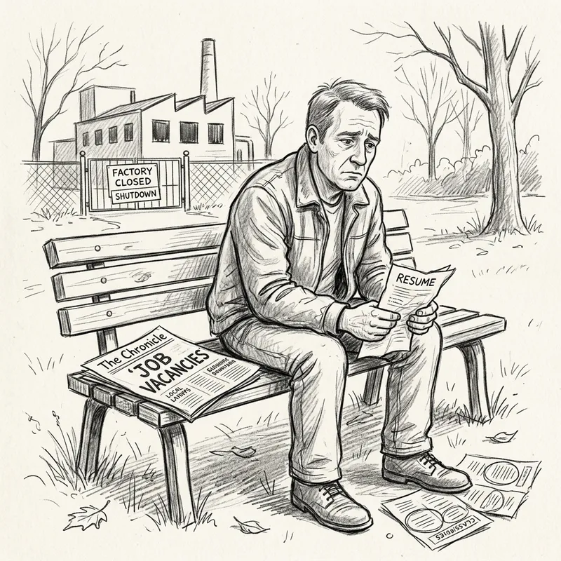 Create a simple, rudimentary pencil drawing illustrating the concept of unemployment. Include elements such as newspapers with large 'Job Vacancies' headlines, a disheartened individual of Caucasian descent sitting on a park bench brooding, a closed factory in the background. His face etched with worry, the man clutches onto his resume tightly in his hand. Weave a visual narrative of struggle and hope through the use of intricate detailing and soulful expressions.