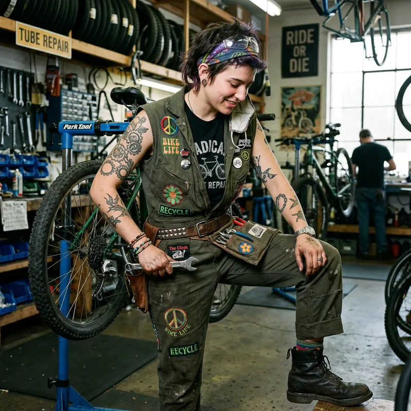 Punk hippie work uniform for a female bicycle mechanic.