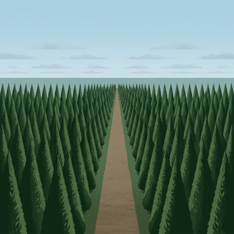 Draw a representation of uniformism, illustrated by a consistent pattern or rhythm using similar colors, shapes, and textures. Further exemplify this concept by showcasing an array of identical items incorporating strict symmetry and an absence of differentiation. It could also involve natural elements like a forest where each tree looks the same or an unbroken horizon, all of which demonstrate the concept of uniformity and repetition.