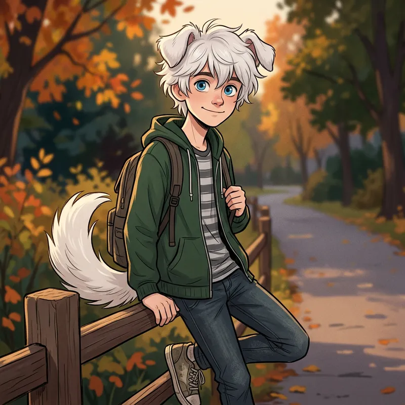 Illustration of a 16-year-old boy with pale skin and blue eyes. His white hair matches the color of his unique features: dog ears and a dog tail. These unusual attributes are also stark white, creating a striking overall image.