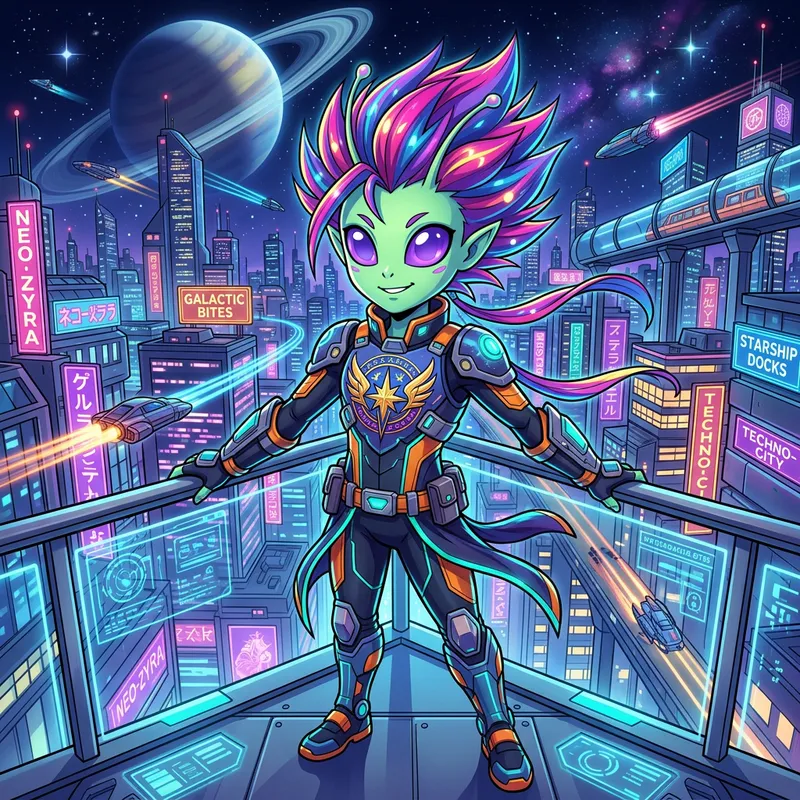 An alien character from a generic anime, maintaining the traditional, vibrant, and exaggerated style commonly associated with anime. The alien has distinct, large, oval-shaped eyes, a small nose, and mouth. Its skin tone is light green with striking contrasts, and its body structure is lithe. Its hair is spiked and multi-colored. It has a unique outfit: a futuristic suit with armor-like attributes, and a prominent emblem on the chest, depicting its alien lineage. The background is a vibrant cityscape with flying vehicles, highlighted by neon tones that remind the viewer of a futuristic city in outer space.