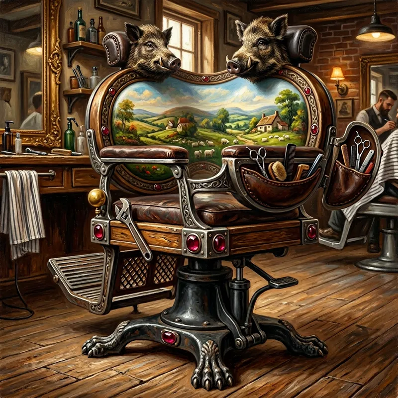 Create a detailed rendering of a unique barber chair with the following specifications: The chair's backrest is circular in shape, furnished with a pastoral landscape pattern. A comfortable head pillow, shaped like a wild boar's head, is situated at the top of the circular backrest. Foam cushioning adorns both armrests alongside sturdy handrails. Cutlerite, a distinct red stone resembling erythrolein, accents the corners of the bezel. The chair also boasts a rugged stepping incline at an upward 45-degree angle. The chair is supported by a durable oil pump chassis, and textured 'Alice feet'— stylized claw-like supports. A perfectly crafted sphere, possibly a control knob, adds to the distinctiveness of the chair, along with a strategically placed wrench. To finish off the unusual design, the back of the chair features an ergonomically fit container embedded into it. This container, made to be easily reachable, smoothly accommodates various hair cutting tools. This depiction should be as an oil painting, with keen attention to lighting and texture.