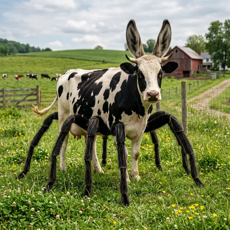 Original Prompt: una vaca con patas de araña y orejas de burro