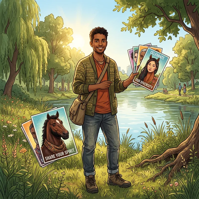 Illustration of a diverse individual standing on a riverbank, lush with abundant, tall trees. This person is holding eye-catching flyers. Intriguingly, each flyer depicts a unique interpretation of a horse with a human face, each showcasing a blend of characteristics from various genders and descents. Overhead, a radiant sun graces the clear sky, casting a warm glow across the scenic landscape.