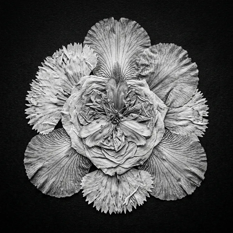 Detailed monochrome photograph of a uniquely pressed flower, forming a 'chimera' composition of iris, carnation, and rose, displayed from a top-down perspective. The image is captured with a macro lens, emphasizing the features of the hybrid flower, and the black background creates high contrast. Utilize HDR effects for a dynamic, diverse tonal range. The style should emulate botanical photography using equipment akin to a high-end camera like a Canon EOS R5.