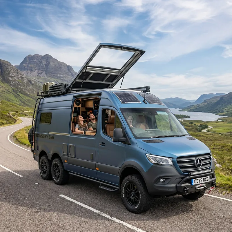 Detailed depiction of a unique van. The vehicle should have six wheels, giving it an extraordinary and advanced appearance. The roof of the van is designed to be open, offering a panoramic view of the sky which should be subtly indicated in its interior design. The color and additional details of the van are free for interpretation.