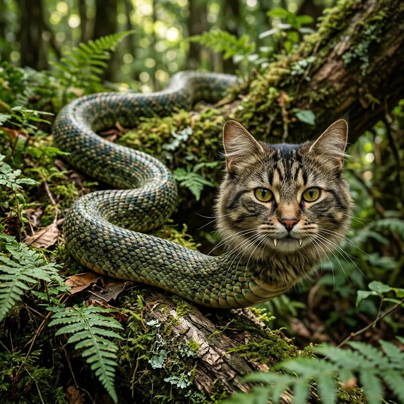 Create a detailed and vivid image showing a close-up of a unique creature. It should look most like a snake, possessing its long, winding body and scaly skin. But in place of a typical snake head, it should have the head of a cat, complete with soft fur, sharp eyes, and pointed ears.