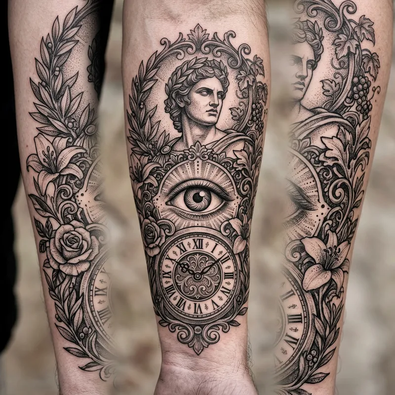 Unique tattoo design featuring a Greek god, floral elements, a Roman clock, and an eye in the center.