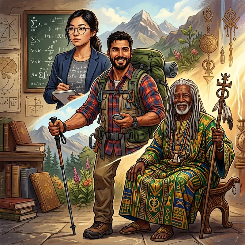 Illustrate an intriguing concept: three diverse personalities embodied in one form. In order to represent this, envision a human figure segmented into three distinct parts. Each part should display differing characteristics, clothing style, and facial expressions to showcase the unique personalities. The top segment could be a young Asian woman with an intellectual demeanor, wearing glasses and a shirt with mathematical equations. The middle could portray an adventurous Hispanic man with hiking gear and a confident expression. The bottom could feature an elderly black man radiating wisdom, dressed in a traditional shaman's robe. They all share one body, emphasizing unity despite individual differences.