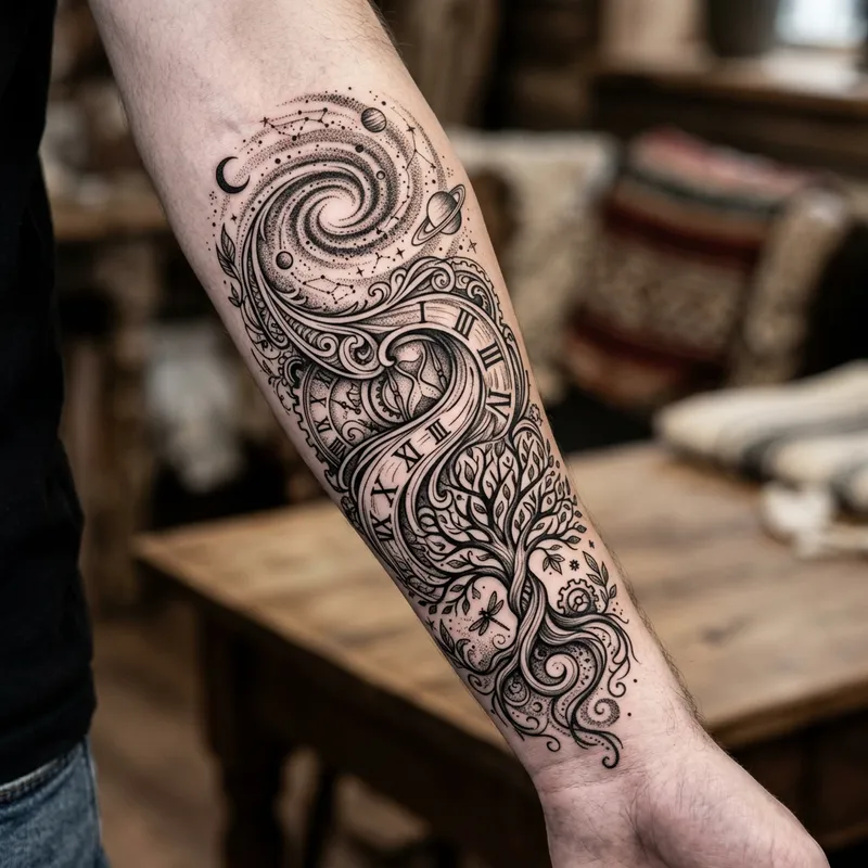 Generate a design for a unique and never-before-seen tattoo. Let the design include intricate lines and swirls that come together to create an abstract representation of nature, time, and the cosmos. Ensure the design balances black and white spaces articulately to add depth and dimension, and includes small detailing that can only be seen upon closer inspection.
