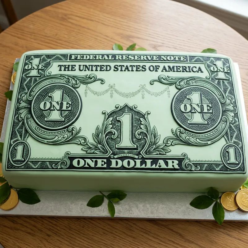 Visualize a unique cake which is shaped and designed to look like a US one dollar bill. This creative confection should have a light green frosting, markings, and decorations to simulate the intricate design of the currency, including details such as the circle on the left with '1' and 'ONE' inscribed and its mirror image on the right, the faint festoon in the middle, and the 'ONE DOLLAR' caption at the bottom. Note that the cake should not depict any real or fictitious individuals, instead, leave these areas blank or fill them with decorative patterns that comply with respectful guidelines.