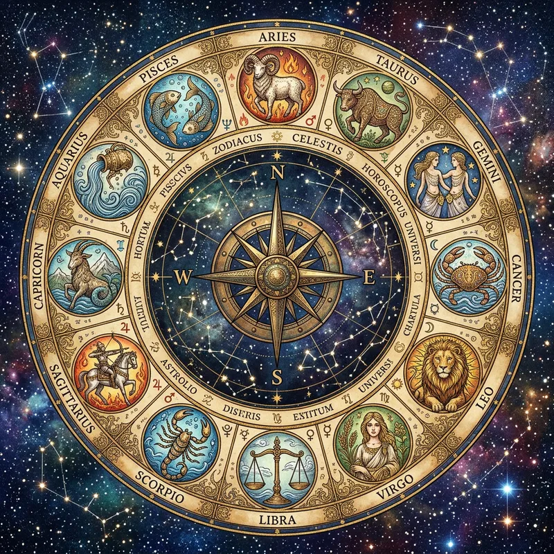 Intricate Zodiac Horoscope Chart with Celestial Symbols
