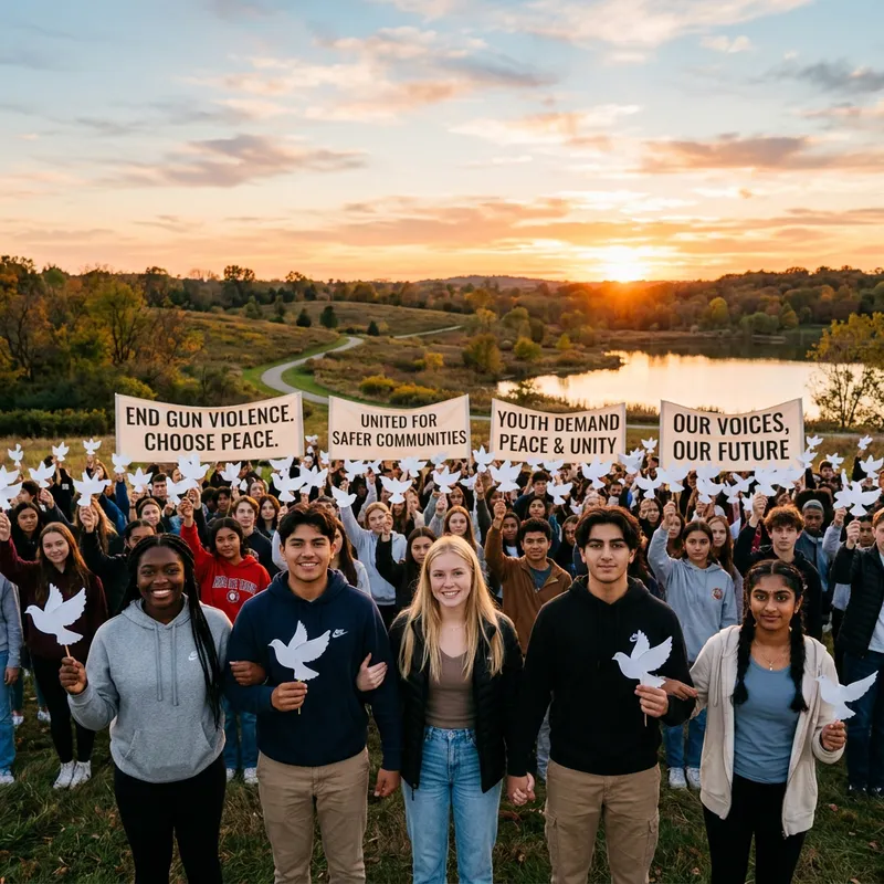 A serene image of a symbolic peaceful protest against gun violence involving youth. It includes young people from varying descents such as Hispanic, Caucasian, Black, Middle-Eastern and South Asian standing unitedly, holding hands. Everyone in the crowd is holding aloft paper doves, symbolizing peace. There are banners with messages promoting peace and unity. The background reveals a peaceful open nature scenery. The sky above is clear amidst a setting sun, casting a warm orange glow that reflects on the faces and banners of the crowd, underlying the tone of hope and determination.