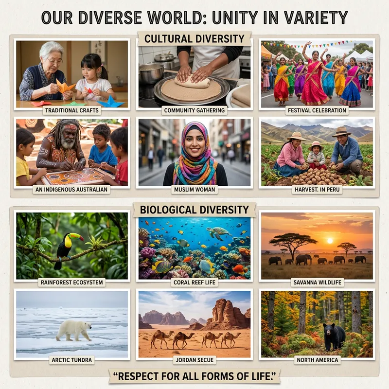 A photographic montage showing the socio-cultural and biological diversity in today's world. One section showcases diverse individuals of different genders, ages, and ethnic backgrounds engaging in a variety of activities, reflecting their culture and everyday life. This includes food preparation, dancing traditional dances, wearing distinct clothing, and more. In another section, an array of different biological ecosystems like rainforests, reefs, tundras, and deserts are showcased, each thriving with unique wildlife and plant life. The image should convey the message of unity amidst diversity, promoting inclusivity and respect for all forms of life.