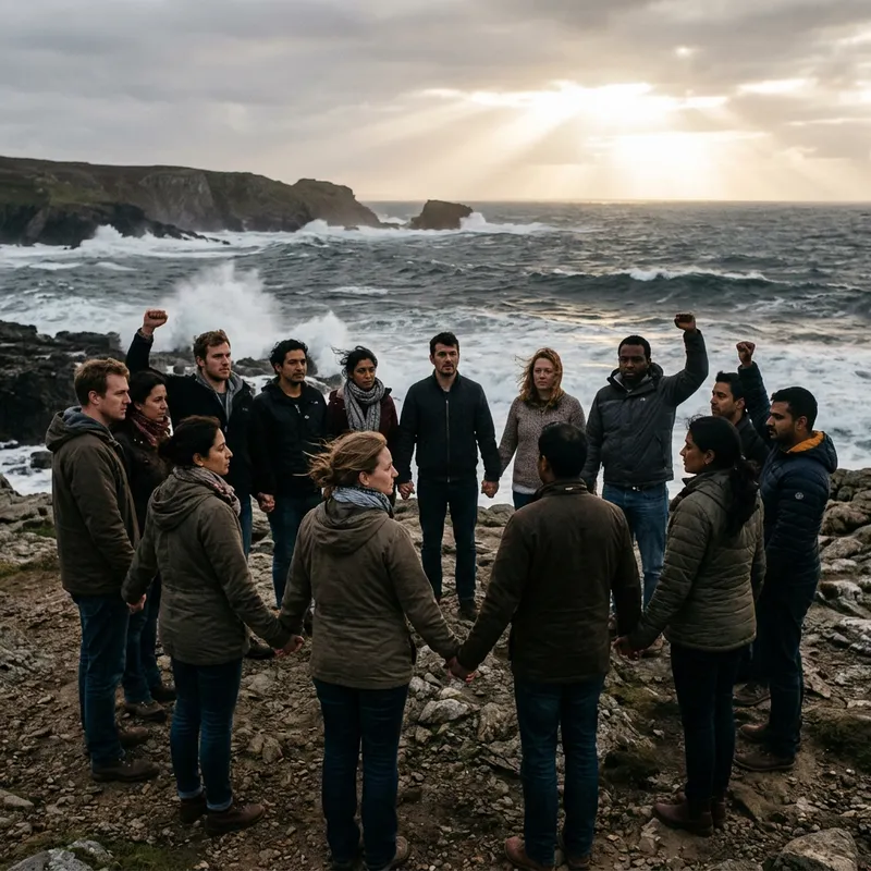 Please illustrate a scene that embodies unity, resilience, and the fight for human rights. The imagery can include a diverse group of men and women of various descents like Caucasian, Hispanic, Black, Middle-Eastern, South Asian, standing together in a circle. They are holding hands, symbolizing unity. Some of them are raising their other hand in a fist, showcasing the fight for human rights. Behind them, an expanse of rough waves, symbolizing the trials and challenges they have faced, but still standing strong, representing resilience. The sky above them is bright showing hope for the future.