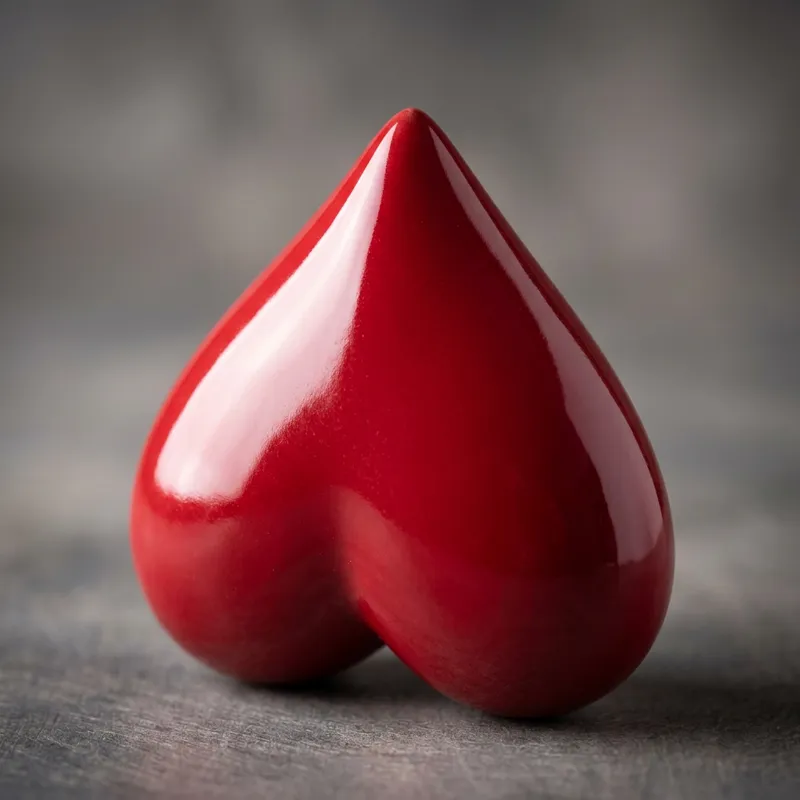 An upside-down heart rendered in a rich, brilliant red color, with a glossy surface reflecting some light. The heart's rounded top is at the bottom, while the pointed end is at the top, inviting a unique perspective of this common symbol of love and affection.