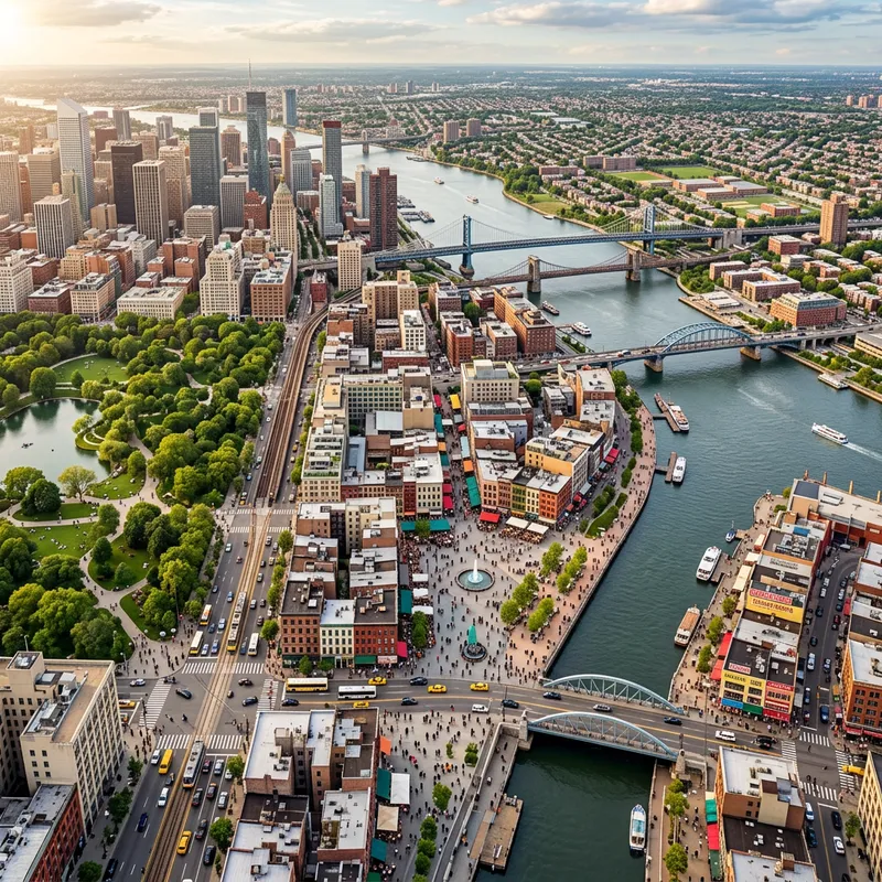 A detailed bird's-eye view showing a range of urban landscapes. Depict dense city blocks with buildings of varying heights, bustling streets, and parks dotted with trees. Include scenes of lively city squares, pedestrian areas filled with people of diverse descents and genders. Also illustrate water bodies, like rivers winding their way through the city, bridges connecting different areas, and distant views of suburb neighbourhoods. Use a mix of warm and cool colors to represent the many facets of urban life.