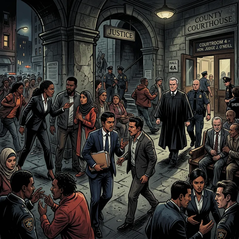 A dynamic representation of the legal justice process inspired by the gritty, urban characteristics of drill music: a busy city courthouse with people rushing around, well-represented lawyers in sharp suits, and stern, conscientious judges. There are intense conversations in corners and palpable tension in the air. This scene channels the vibrancy and intensity of drill music's rapid-fire percussion and deep, resonating bass. Apply this feel to the color scheme (dark, contrasting hues) and style (bold, edgy lines). For diversity, include people of different genders and descents such as Caucasian, Hispanic, Black, Middle-Eastern, and South Asian.