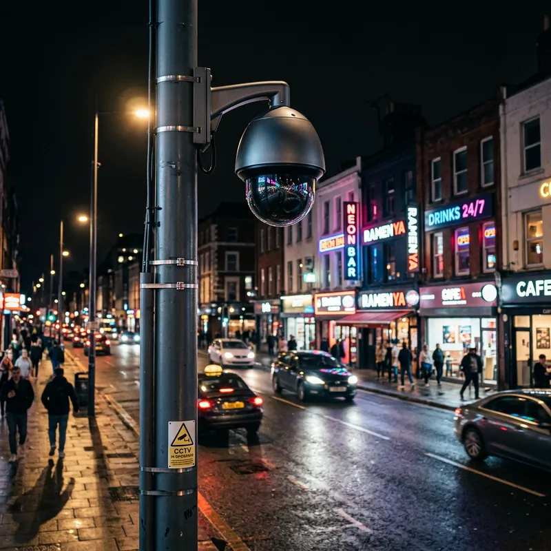 Urban Night Scene with CCTV Camera